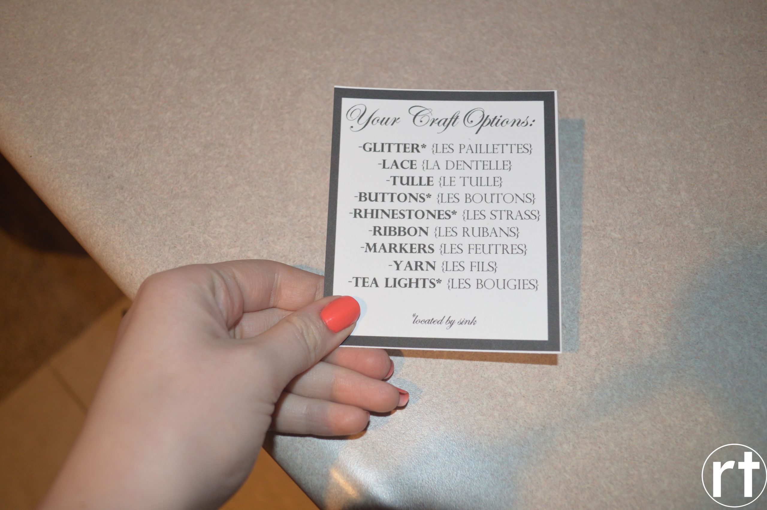 Unfortunately, the Eiffel Tower will probably be booked the weekend you’re having your party and thus can’t be shipped to your doorstep. But there are some other options that can bring the ambiance back. An easy activity is popping in a movie set in Paris. I went with Midnight in Paris with Owen Wilson. But there’s also fun, girly movies like Monte Carlo with Selena Gomez or classics like Funny Face with Audrey Hepburn. If you want a more involved activity, try a craft. For my party, I chose to play off of Paris’s nickname “City of Light.” My guests were each given a clean mason jar and could decorate it with glitter, lace, jewels, tulle, etc. Afterwards we put in tea lights to make it a candle. This was a hit considering my friends still tell me they’ve kept theirs. I even keep mine on my desk!