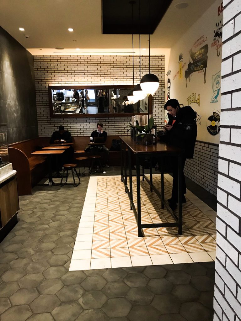 Imagine that. Other than the no Wifi, I enjoyed the atmosphere with its honeycomb-tiled floors, long wooden tables to stand at and typography-covered walls.
