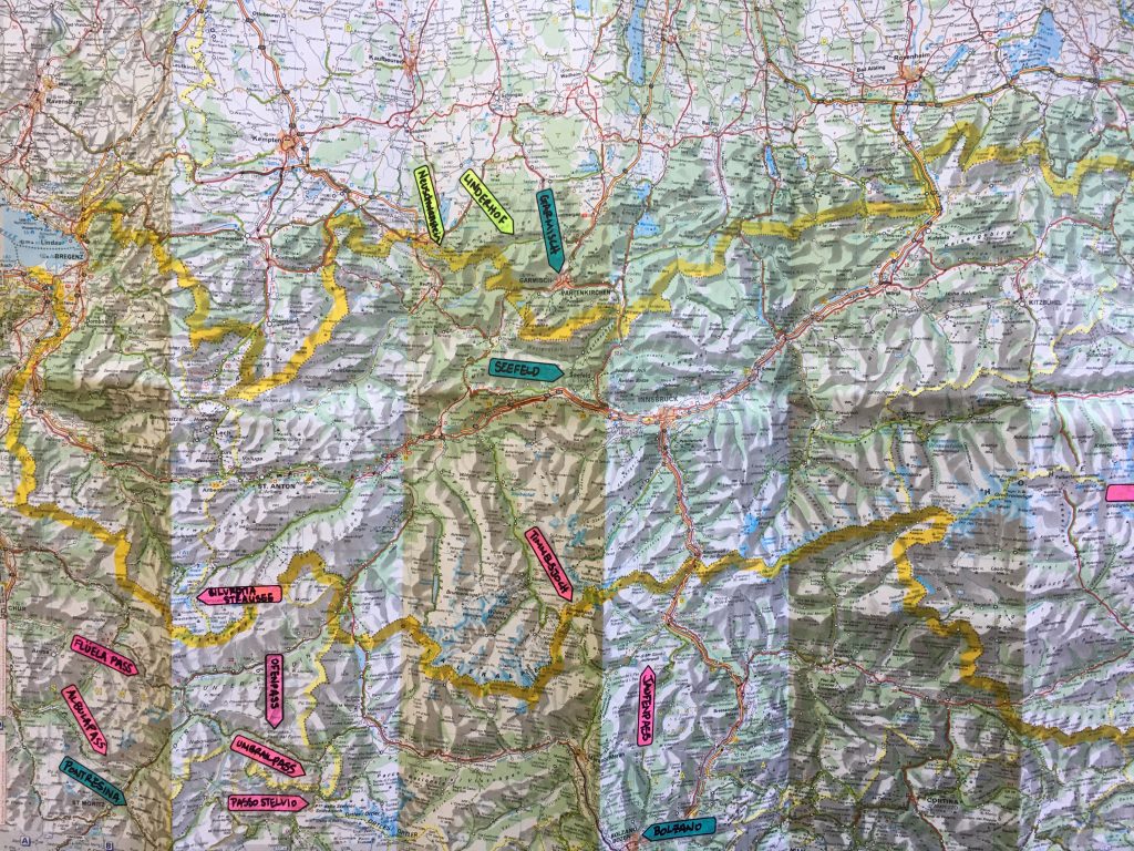When I began planning, I dug out my old journals from the Edelweiss trip in 2009 and used them as a starting point. I purchased a few giant paper maps of Switzerland and Austria that encompassed the entire area that we’d be covering. And I used a lot of tape flags to mark potential mountain passes. I had flagged all the potential passes that we might like to ride based on online reviews from other motorcyclists as well as my previous trip. Ryan dug in doing research to see what they actually look like to ride.