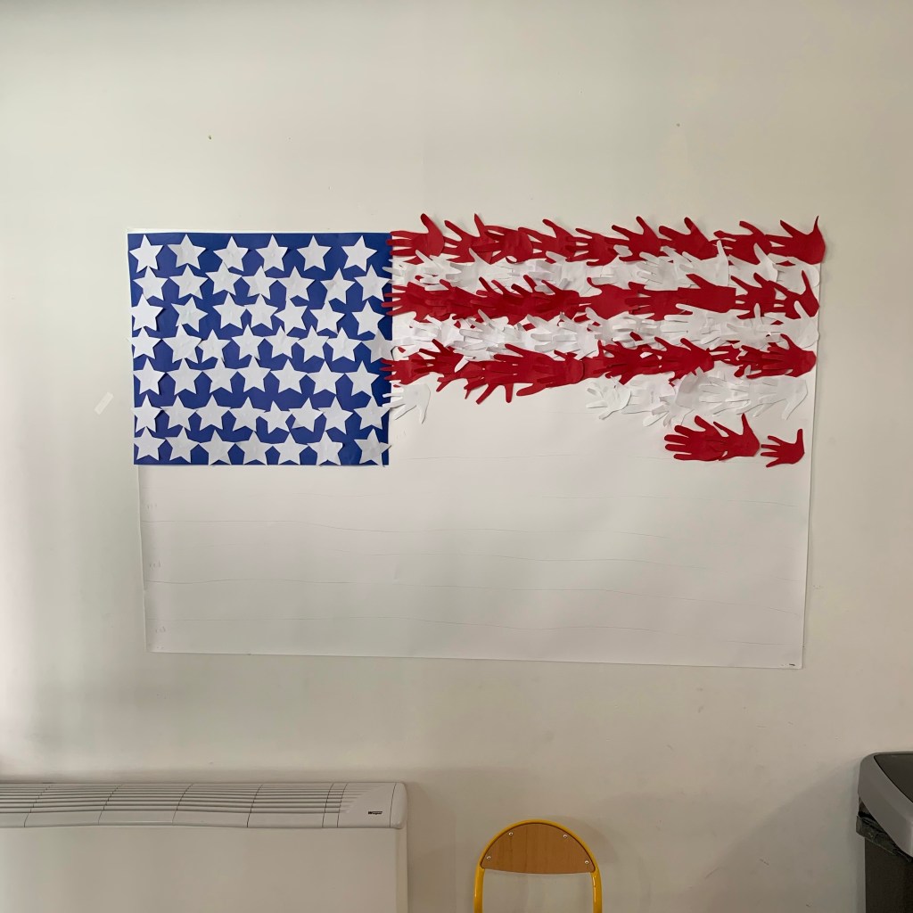 Or you can opt for a multi-classroom project by creating a large American flag out of student hand cut-outs. I asked all of my classrooms to have their students trace their hands on colored paper. Each class then came down to the common room where we taped up their hand cut-outs to create an American flag. It was a great way to integrate all of the classes of different ages and to create a small souvenir of their favorite English teaching assistant. (And humble, too!)