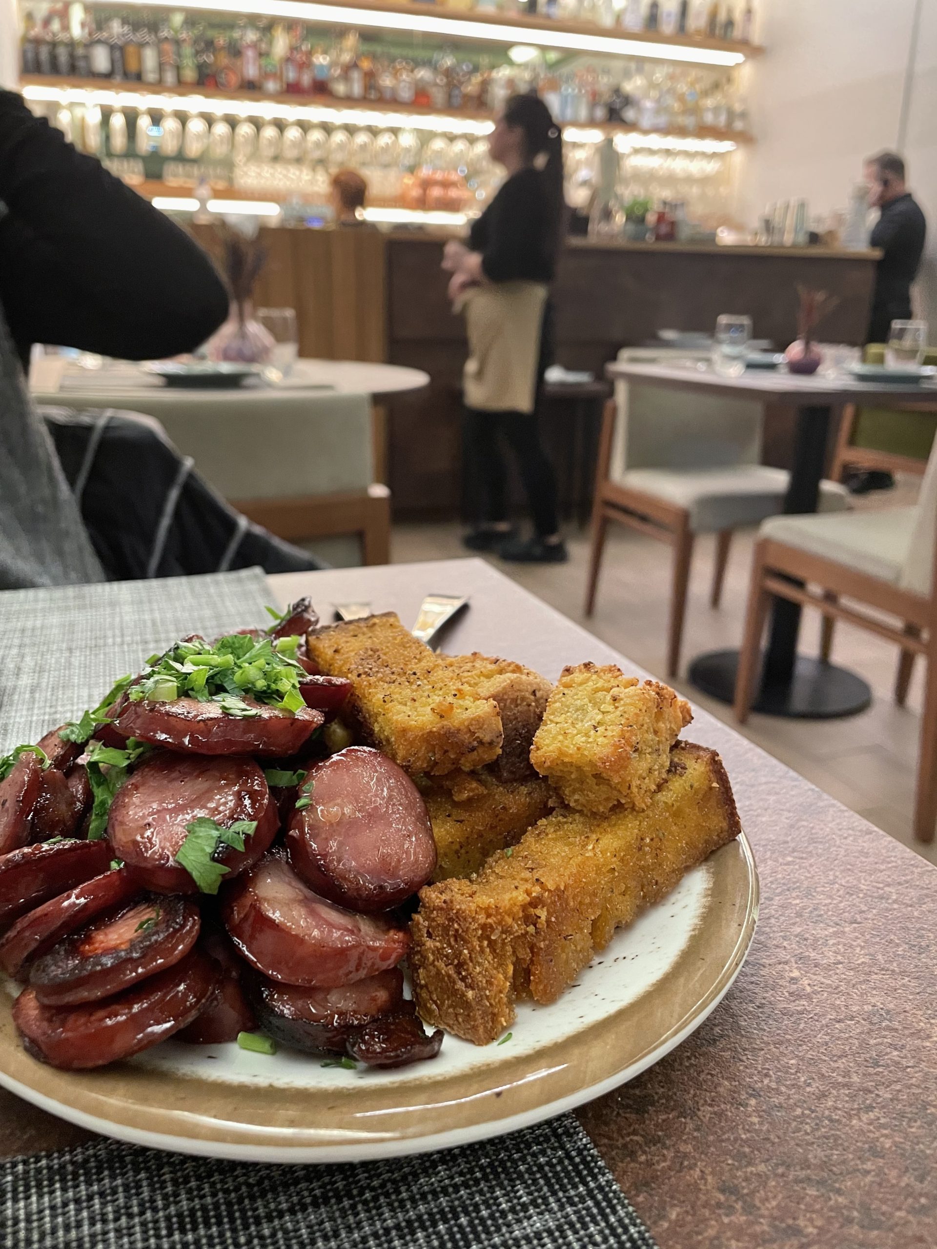 My flight got in later, and I met Amber at our Airbnb to drop off my things. First things first: dinner! We looked for something nearby and open and landed on Porta Oito Petiscos & Bar. This classy restaurant serves up Portuguese small plates. We each ordered several appetizers and ate to our heart’s content. I ordered their Chouriço Assado com Broa Embebida em Azeite, or chorizo with traditional corn bread, and sweet potato fries. And wow, my mouth is still watering thinking about this meal months later! We stumbled upon this place, but it ended up being a favorite.