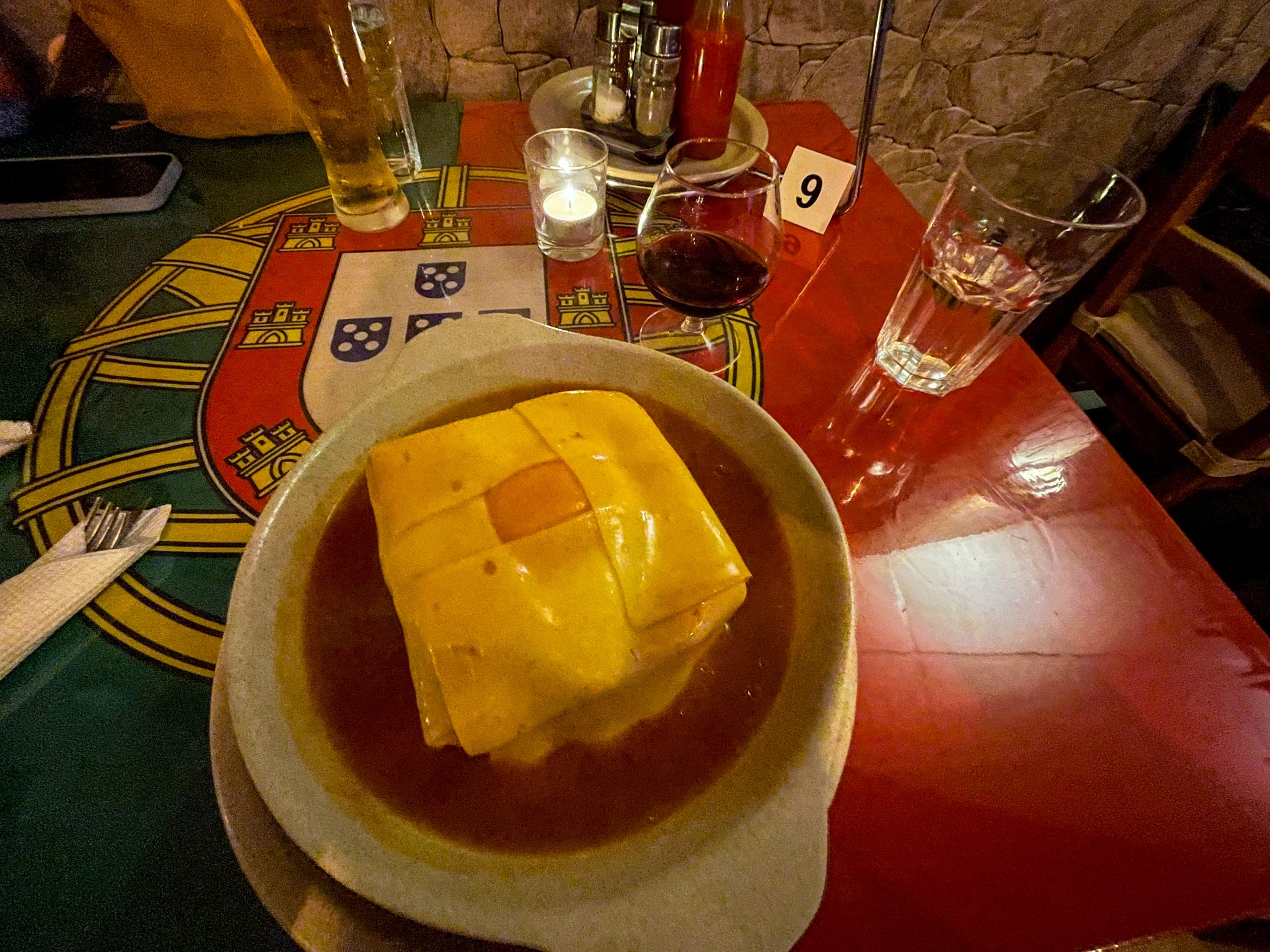 One of Porto’s famed dishes is the francesinha, which is like a multi-layer grilled cheese but add several types of meat and add sauce. And topped with an egg! The word means “little French,” and the story goes that a Portuguese immigrant living in France was inspired by the French croque-monsieur sandwich and brought it back, per Portugal.com. Being gluten-intolerant, I often have to pass by on local breaded specialities. But I was so excited to discover Tasquinha do Bé, a restaurant that offered both regular and gluten-free francesinhas. Amber and I had a lovely evening attempting to finish our hearty, delicious francesinhas paired with a glass of port wine.
