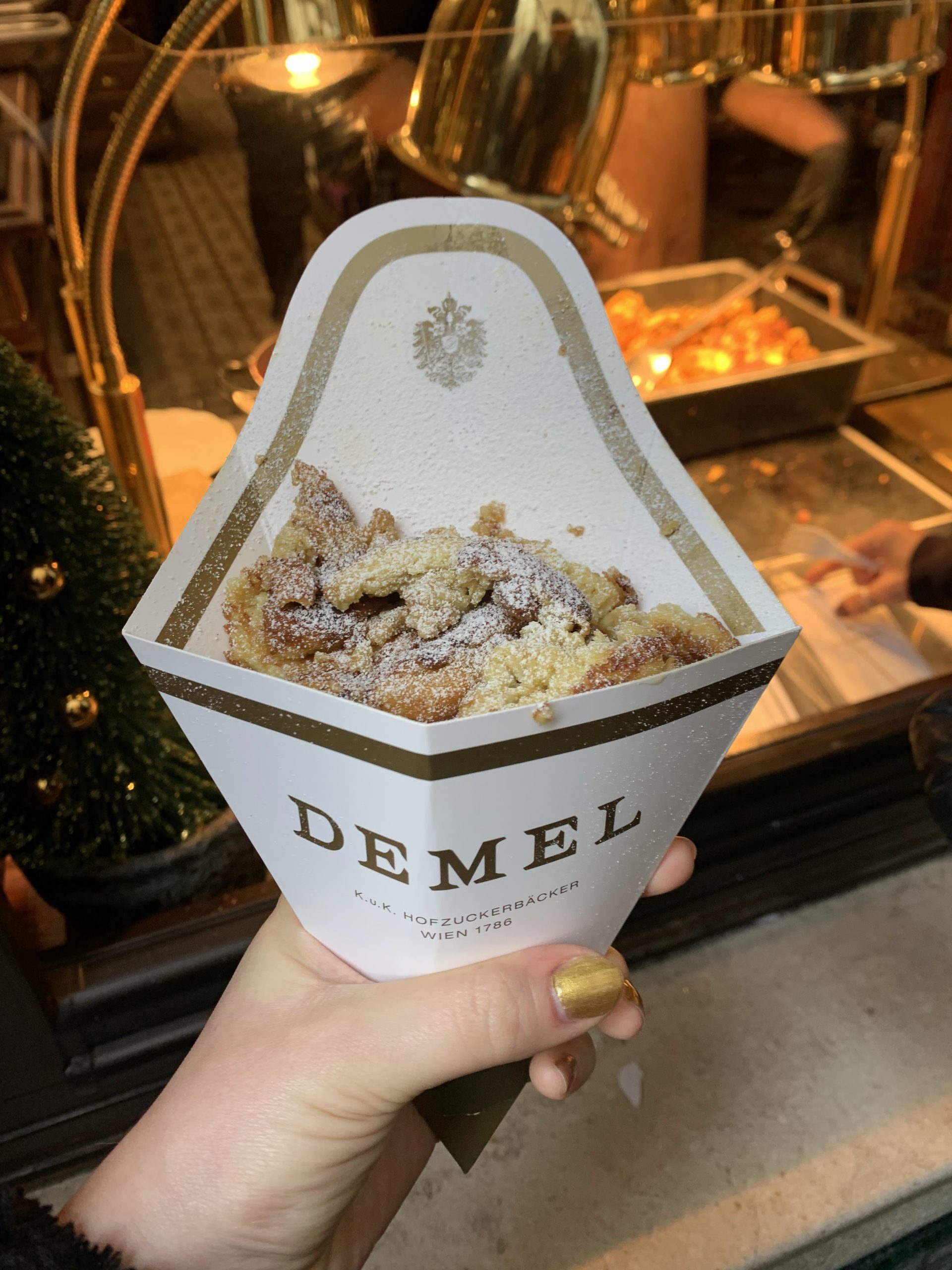 No time for a sit-down meal when it’s Christmas market exploring time! Luckily at the Rathaus Christmas market, they sold their sausage and fries smothered in ketchup in a paper cone paired with a tiny fork. In theory, that meant that you could walk and eat. But my lack of gracefulness, the snow falling and the excess of ketchup made me grateful that this wasn’t a first date.