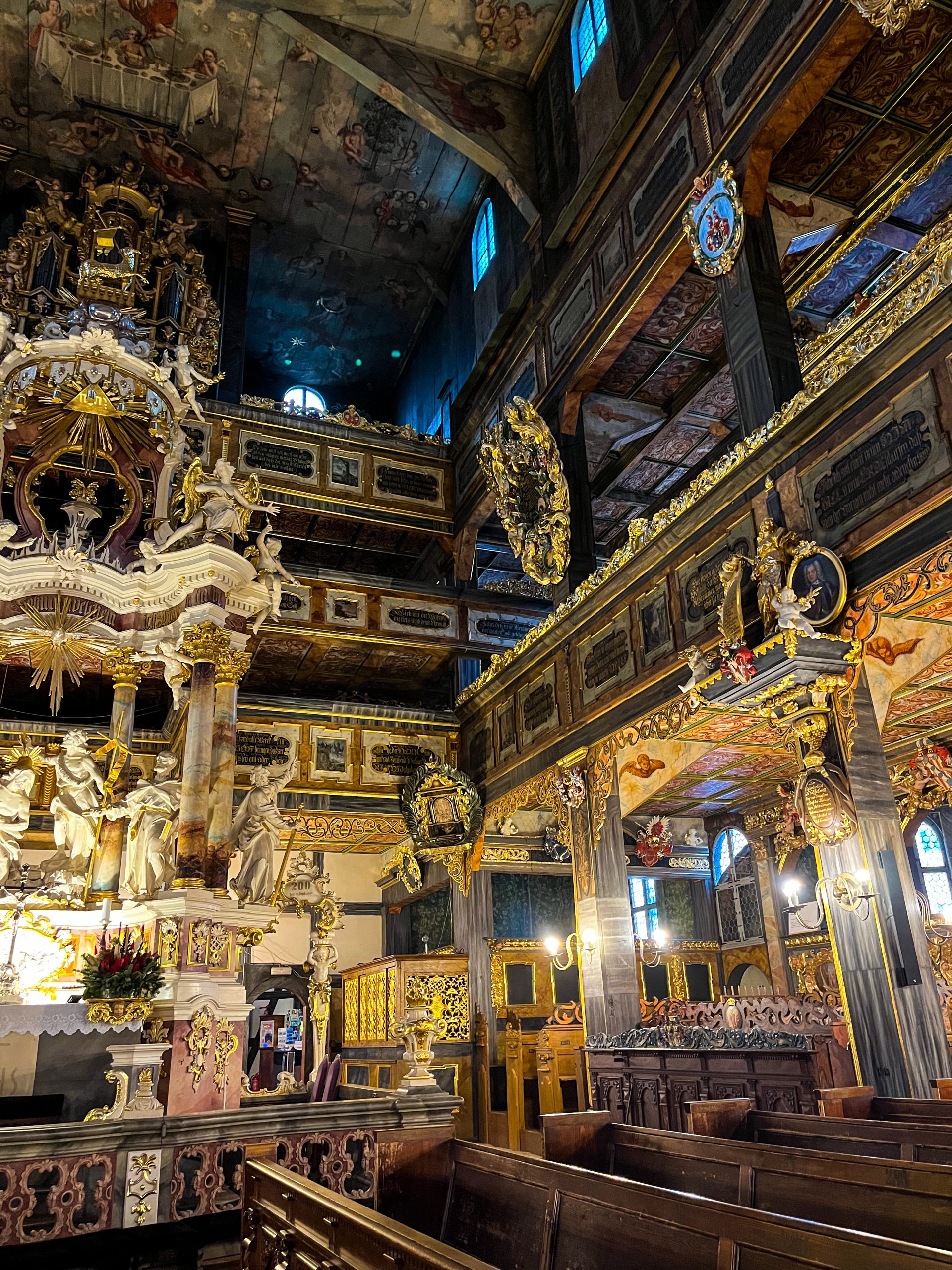After free time for lunch, our guide drove us to the Church of Peace in Świdnica. This UNESCO World Heritage site was built by the Lutherans following the Thirty Years’ War. I’ve seen lots of churches in Europe, but this one stands out for its timber frames. However, it is filled with Baroque art and architecture on the inside.