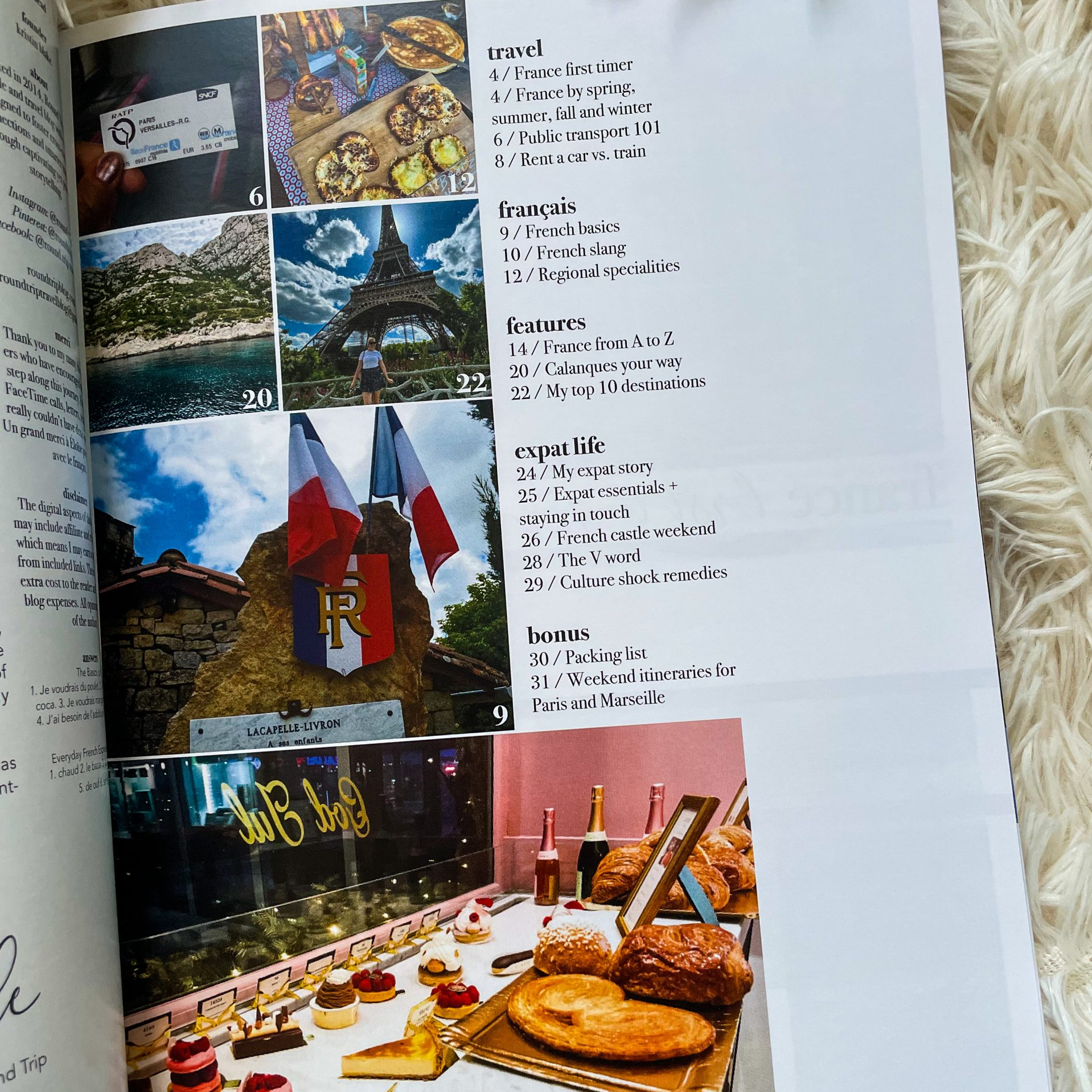 Stick around to the end of the magazine where you can cut out four different handy resources: a Paris weekend itinerary, a Marseille weekend itinerary, a list of helpful French phrases and a list of books and movies set in France.